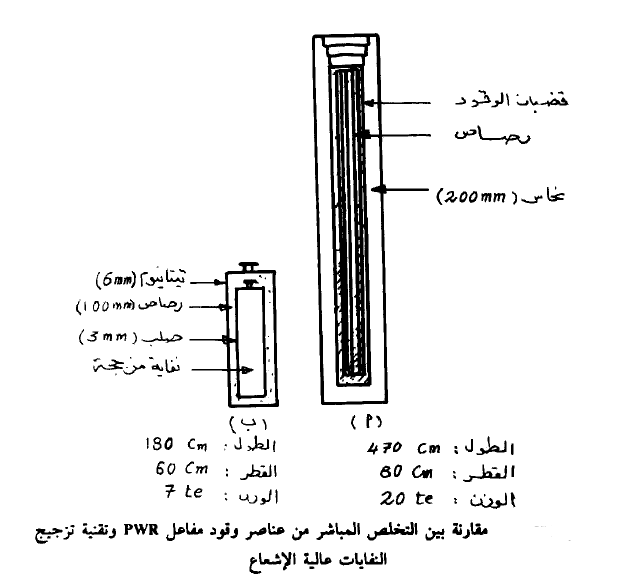 يبين الشكل (3) مقارنة بين التخلص المباشر من عناصر وقود مفاعل PWR وتقنية تزجيج النفايات عالية الإشعاع. حيث يتضح هنا أن التخلص المباشر من الوقود ينتج عنه حجماً أكبر من النفايات المشعة من مثيله المستخدم فيه تقنية الترجيح (تحويل النفايات إلى مواد زجاجية).