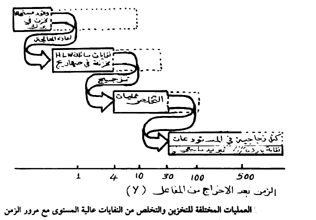 يبين الشكل (4) العمليات المختلفة للتخزين والتخلص من النفايات عالية المستوى مع مرور الزمن.