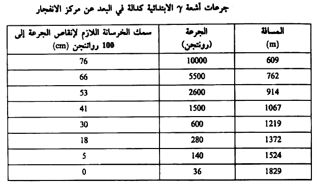 عند حدوث انفجار نووي تنتج أشعة γ عن الانشطار النووي وتتراوح طاقة أشعة γ بين 0.5، 5 م.ا.ف. وعندما تتحرك هذه الأشعة في الهواء فإنها تفقد طاقتها عن طريق تفاعلاتها مع المادة. ومن ثم تقل هذه الطاقة كلما ابتعدنا عن مركز الانفجار وتدل القياسات على أن طاقة أشعة γ تهبط إلى 3 م.ا.ف. على بعد قدره حوالى كيلومتر واحد من مركز الانفجار. نبين في الجدول (2) جرعات أشعة γ الابتدائية كدالة في البعد عن مركز الانفجار وسمك الخرسانة المسلحة اللازم لتقليل هذه الجريمة إلى 100 روتنجن. يمكن استخدام الملاجيء: التحت أرضية للعمل على حماية الإنسان من هذا الإشعاع.