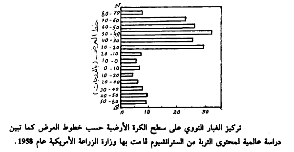 يكمن خطر الغبار النووي هذه الأيام في احتوائه على السترنشيوم - 90 الذي يمثل خطراً كبيراً على الصحة العامة. فالسترشيوم يماثل الكالسيوم من حيث التركيب الكيميائي كما وأنه يترسب في الهيكل العظمي للإنسان كما الكالسيوم. فعندما يصل السترشيوم المتساقط مع الغبار إلى سطح الأرض ينتقل إلى المحاصيل الزراعية والأعشاب ومن ثم يصل إلى غذاء الإنسان وشربه كما يبين ذلك الجدول (4) الذي يبين الجرعات اليومية التي يتناولها الإنسان من السترشيوم في غذائه. لقد تبين أيضاً أنه في مناطق بعيدة عن مركز الانفجار فإن معدل تراكم السترانشيوم يعتمد على خط العرض على الكرة الأرضية. كما يوضح ذلك الشكل (2) الذي يبين تركيز الغبار النووي (السترانشيوم) على