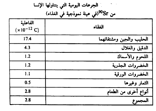 يتضح من الجدول (4) أن أهم مصدر للسترشيوم في الغذاء هو الحليب والغلال. وهنا يكمن الخطر. ففي حالة البالغين لا يساهم الحليب الذي يشربونه في بناء هيكلهم العظمى بل يحتاجون لكمية قليلة من الكالسيوم (ومن ثم سترانشيوم) الذي يطرد بسرعة (ومعه السترانشيوم) خارج الجسم. أما في حالة الأطفال فإن الكالسيوم يستخدم لبناء العظام ومن ثم يترسب فيها ومعه الستراشيوم المشع.