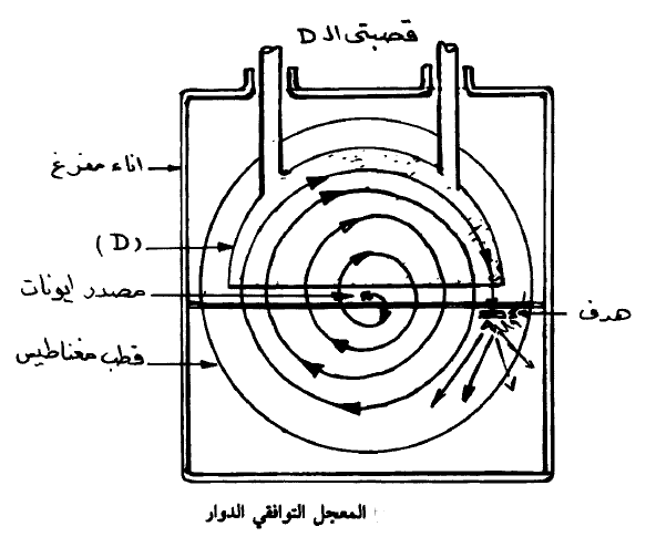 نبين في الشكل (1) تصميماً للسينكروسايكلوترون (أو المعجل التوافقي الدوار) العامل في بيركلي. حيث استخدمت هنا (D) واحدة فقط بينما وصل أحد طرفي المذبذب بهذا الصندوق والطرف الآخر بالأرض. وقد أجريت تعديلات أخرى على هذا الجهاز حيث بلغت الطاقة 750 م. أ. ف. وهناك العديد من هذه الأجهزة المنشرة الآن حول العالم.