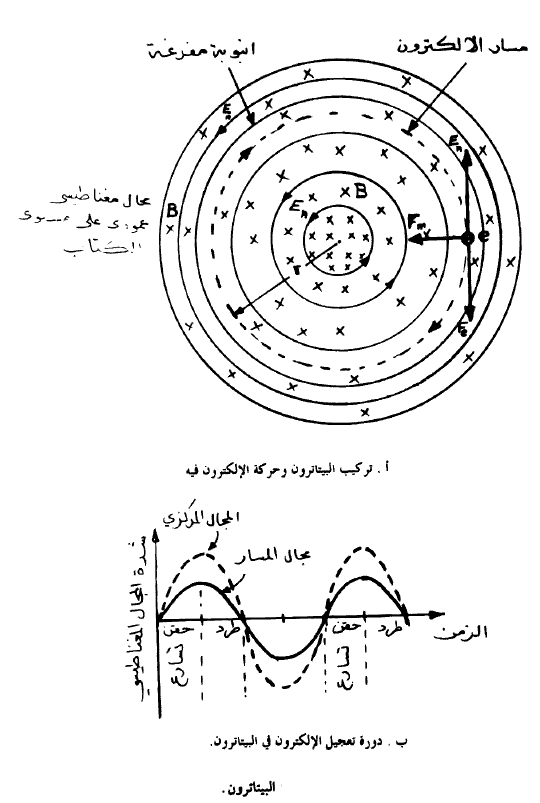 في الشكل (1 .ب) الذي يبين دورة تعجيل الإلكترون في البيتاترون نجد أنه عندما يكون المجال متزايداً وذلك في ربع الدورة الأولى فإن طاقة الإلكترون تتزايد حتى يصل المجال إلى قيمة القصوى. وخلال هذه الفترة الزمنية (1/240 ثانية) يكون الإلكترون قد عمل آلاف الدورات (حوالي 250,000 دورة). وعند تلك اللحظة الزمنية يتم استخراج (طرد) الإلكترون من المدار. وهكذا نجد أنه يتم حقن الإلكترون في الأنبوبة (ومن ثم في المجال) عندما يكون المجال المغناطيسي متزايداً (الشكل 1 ، ب) حتى يصل المجال إلى القيمة العظمى، ثم يسمح للإلكترون بالمغادرة في ربع الدورة التالي. وتعاد الكرة من جديد مع بداية دورة جديدة (كما بالشكل).