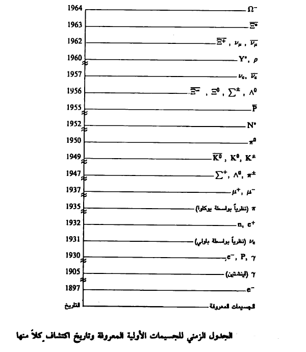 يبين الشكل (1) الجدول الزمني للجسيمات الأولية المعروفة وتاريخ كتشاف كلا منها وكما يبين الجدول فإن هناك العديد من هذه الجسيمات التي اكتشفت منذ الثلاثينات ومن ثم سنناقش فيما يلي كلا من هذه الجسيمات بشيء من التفصيل.