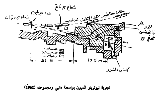والميونات الناتجة. أما النيوترينات فيمكنها بسهولة اختراقه حيث تسقط على كاشف الشرر الذي تبلغ كتلته عشرة اطنان. ويتألف من 90 لوحا من الألمنيوم سمك كل منها بوصة واحدة ومساحته أربعة أقدام مربعة. ويفصل بين هذه الألواح كتل من البلاستيك الشفاف سمك كل منها 3/8 بوصة يمثل كاشف الشرر حجماً حساساً ضخماً للكشف عن النيوترينات التي يصعب أسرها بواسطة التيوترونات والبروتونات. وسوف نبحث عن تفاعلات النيوترينات الخاصة بتحلل البايونات (معادلتي 1، 2) مثل: