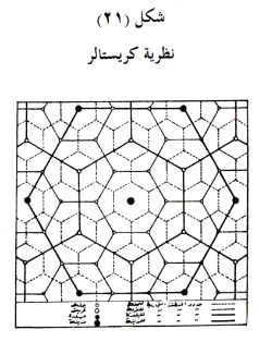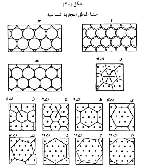 ٢- بيد أن تجاور المناطق التابعة الدائرية، يؤدي، بالطبع، إما إلى تقاطعها، وإما إلى تماسها وترك فجوات بلا خدمات فيما بينها. ومن مناقشة مختلف الأشكال الهندسية يتبين أن المضلع السداسي أقربها إلى الدائرة، ويحقق معظم شروطها، فهو لا يؤدي إلى التداخل الوظيفي ولا يخلف بينها فراغاً وظيفياً. وتبعاً لذلك، يفتض (كريستالر) أن المراكز التجارية سوف تتوزع في أنماط سداسية، ومناطقها التجارية سوف تأخذ أشكال مضلعات سداسية بدلاً من الدائرية، كماهو واضح في الشكل(٢٠).