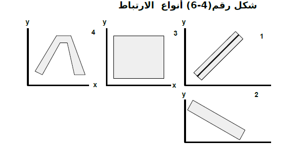 - مقاييس الارتباط: وتعني قياس العلاقة بين متغيرين أو اكثر وهذه العلاقة قد تكون طردية أي الارتباط موجب أو عكسية أي الارتباط سالب, شكل رقم (4-6) يوضح أنواع الارتباط.