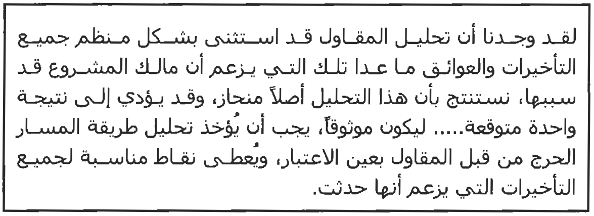 إن نقد القاضي كان نتيجة لاستخدام المقاول التحليل بطريقة التأثير على الجدولة الزمنية التخطيطية ، لأنها تجاهلت كل شيء آخر ماعدا الجدولة الزمنية التخطيطية والتأخير الذي قيمه المحلل، والذي كان محدداً مسبقاً، وأحياناً قد يكون تأثير التأخير الذي أدخله المحلل مبالغ به. سنوات من الخبرة في تحليل التأخيرات باستخدام طريقة التأثير على الجدولة الزمنية التخطيطيـة قـد أكـدت هـذا الحكم. وبالتالي ، فإن تحليل التأخيرات بالاعتماد فقط على وجهة نظر بداية المشروع وتوظيف تقنية التأثير على الجدولة الزمنية التخطيطية التحليلية هي خاطئة ، ويجب تجنبها.