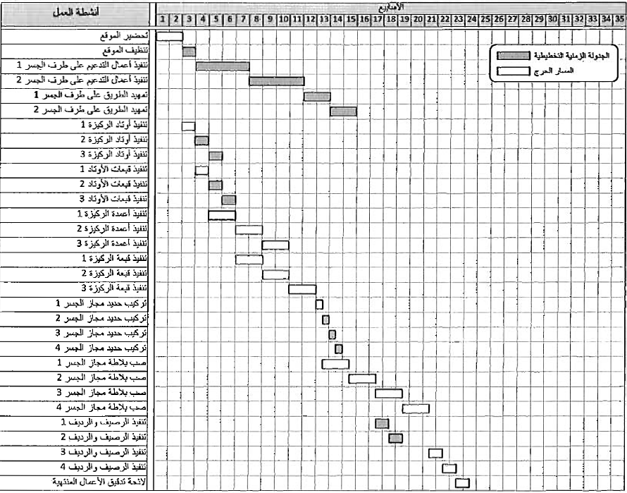 شكل (4) مخطط شريطي تفصيلي لمشروع إنشاء الجسر - تحديد المسار الحرج.