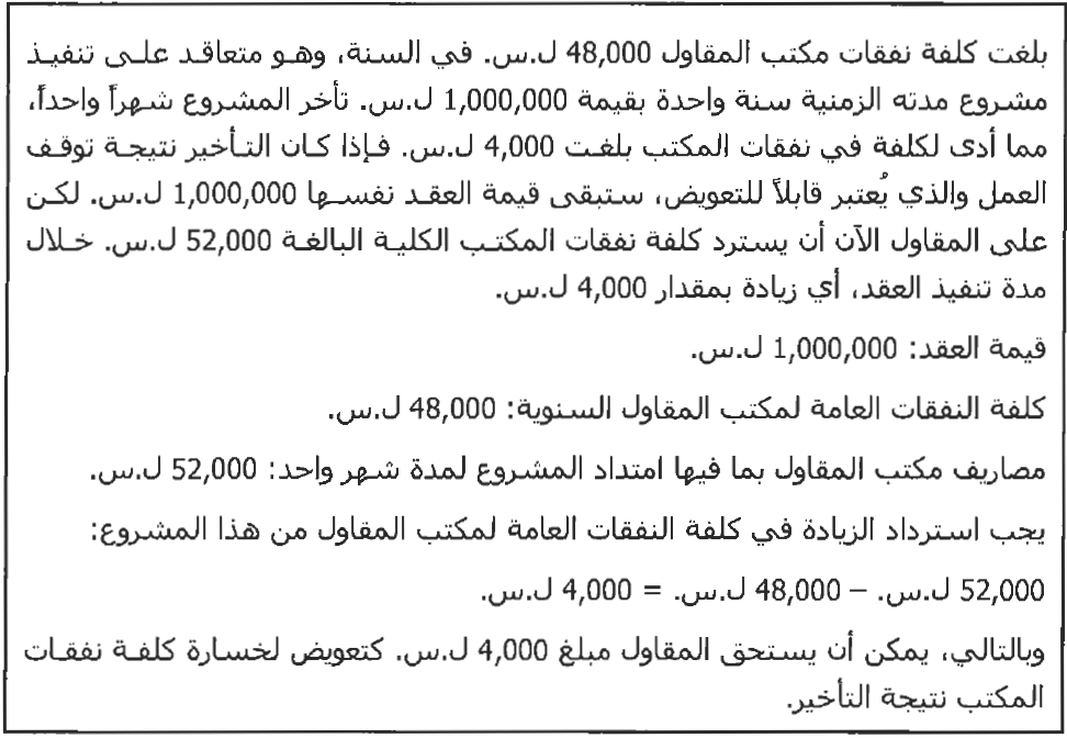كما ذكرنا سابقاً، يضمن المقاول عـادة نسبة مئويـة مـن الكلفة المباشرة للعقـد ضـمن السعر النهائي للعرض الذي يقدمه حتى يغطي من خلالها بعضاً من النفقات العامة لمكتبه. فإذا تأخر ذلك المشروع ، فإن الفترة الزمنية لتعويض عائدات المشروع ستكون أطول، خلافاً للتوزيع الأصـلـي الـذي قـام بـه المقاول لتغطية نفقات المكتب.