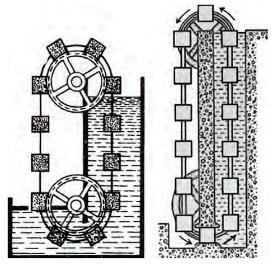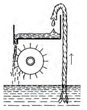 نموذج من المحرّكات الأبدية التي تستخدم فقدان الوزن نتيجة وجودها في الماء. (مصدر الصورة: لانداو، ل. وكيتا يجورود سكي، أ، الفيزياء للجميع، ص118.) النموذج مصمم وَفْق قانون طفو الأجسام في الماء، يبلغ ارتفاعه 20 مترًا، وقد وضعت في أعلى البرج وأسفله بكرات يلتف حولها حبل متين على هيئة سير، وربط هذا السير 14 صندوقًا مكعبا فارغًا من الداخل، وكلها مصنوعة من صفائح حديدية لا ينفذ الماء داخلها، حجم كل منها 1 متر مكعب. ولدى وجود الصناديق في الماء ستُحاول أن تطفو إلى السطح مدفوعة بقوة الدفع للأعلى، لكنها لن تستطيع بسبب التوازن بين طرفي الدولابين وقُوى الإعاقة والاحتكاك والثقل بين الصناديق الموجودة داخل البرج المائي. مصدر الصورة والتعليق: إسماعيل محمد طوسون، نماذج مثيرة لمحاولات الإنسان الأولى لإنتاج الطاقة من العدم، ص 14.)