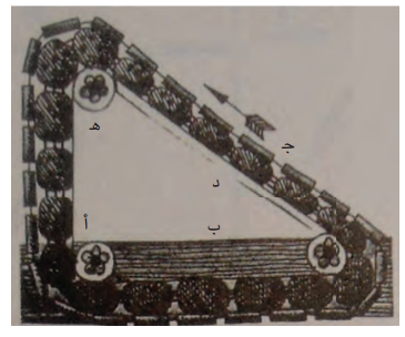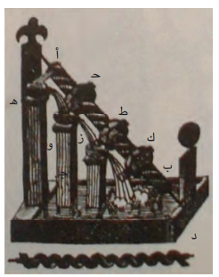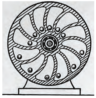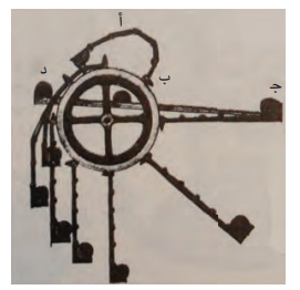 دولاب يفتقد للتوازن ويحوي على أذرع طويلة ذات مفاصل «أ» تسقط بصورة عمودية تماما لتتلقى كرةً تتدحرج في مجرى حتى «ج». وكان المفروض في ثقل الذراع أن يُفقد الدولاب توازنه فيجعله يدور، أما الواقع فهو أن الدولاب مُتوازن. ويلسون، ميتشل، الطاقة، ص63.)
