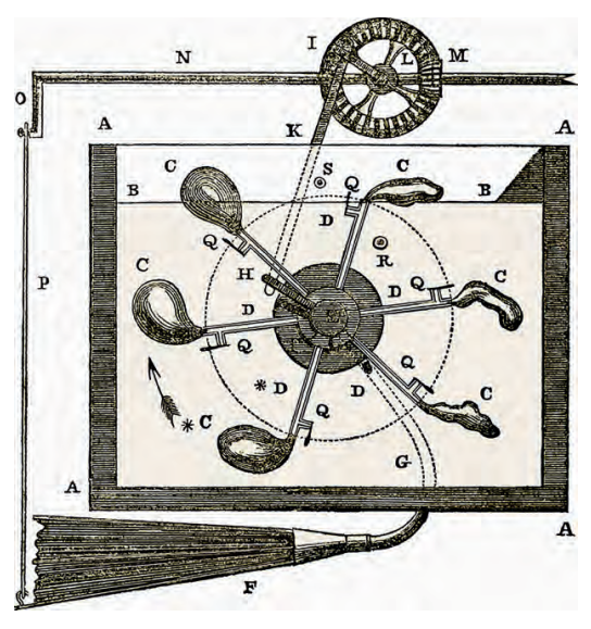تصميم المحرك أبدي يعود لعام 1823م ، يعتمد على مبدأ تفاوت الضغط بين الماء والهواء. تتكون هذه الآلة من منفاخ F، يتم ضخ الهواء بوساطة أنبوب P، ويتم تحريكها بوساطة الساعد N والعجلة L؛ حيث يتم تدوير العجلة L بوساطة القضيب K، الذي يتم تحريكه بواسطة الساعد H المتصل مع المحور B، الذي يوجد في خزان من الماء ويدفعه 6 أكياس هوائية C. عندما يكون الكيس في أدنى نقطة له، يمتلئ بالهواء من المنفاخ. وهذا يجعلها منتفخة وبالتالي يتحول المحور B في اتجاه عقارب الساعة. عندما يُغادر الكيس الماء، يفتح المقبض S صمام Q، الذي يتيح خروج الهواء من الكيس. (مصدر الصورة والتعليق /http://www.sciencephoto.com).