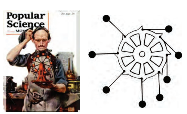 (إلى اليمين) تصميم للمحرِّك الأبدي الذي ظهر في القرن 13م، وقد قامت إحدى المؤسسات العلمية في موسكو بإعادة تصميمه عام 1910م. (مصدر الصورة والتعليق: لانداو ل. وكيتايجورود سكي، أ، الفيزياء للجميع، ص116.) (إلى اليسار) حتى أوائل القرن العشرين كان للمحركات الأبدية صداها على غلاف مجلة «بابولار ساينس الصادرة عام 1920م.