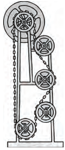 من المفترض أن يعمل هذا التصميم بحيث إن السلسلة الثقيلة تمُرُّ خلال عجلات بحيث يكون نصفها الأيمن أطول من النصف الأيسر في جميع الأحوال، وبذلك يُصبح الجانب الأيمن من السلسلة أثقل من الأيسر، ويختل التوازن بين الجانبين وتدور العجلات كلها. لكن الدوران لن يحدث لأن السلسلة الثقيلة اليمنى ستتوازن مع الخفيفة اليسرى إذا كانت القوى المسلطة عليهما مختلفة الميل؛ فاليُسرى مشدودة عموديا واليمنى مائلة؛ لذلك لن تتمكن – مع ثقلها – أن تسحب اليسرى وبالتالي لن تدور العجلات (مصدر الصورة والتعليق: إسماعيل، محمد طوسون نماذج مثيرة لمحاولات الإنسان الأولى لإنتاج الطاقة من العدم، ص14.)