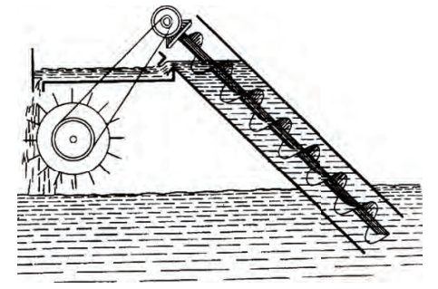 في القرن السادس عشر استُخدم مبدأ أرخميدس في اللولب من أجل دولاب مائي ذاتي الدوران؛ فالأنبوب «ب» (في الأسفل) أسطوانة لولبية، كان يستهدف رفع الماء في دورانه. وإذْ ذاك يجري الماء من الذروة «أ» إلى التجاويف «هـ، و ، ز» ثم المجاديف «ح، ط ، ك» المربوطة في الأسطوانة لجعلها تواصل دورانها. ويلسون، ميتشل، الطاقة، ص63.
