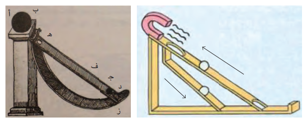 (إلى اليسار) تصميم بسيط لمحرِّك دائم الحركة يعتمد على وضع قطعة مغناطيس كبيرة «أ» كان يُفترض فيها أن تستطيع جعل الكرة الحديدية «ج» تصعد المنحدر «ف»، حتى إذا بلغت هذه الكرة الثقب «هـ» سقطت منه إلى المجرى «ز» الذي يحملها إلى الثقب «د»، حيث يجذبها المغناطيس من جديد (المرجع السابق نفسه، ص63) إلى (اليمين) تصميم آخر لمغناطيس يجذب كرة حديدية تتدحرج على مستو مائل مصدر الصورة: الموسوعة العربية العالمية، مدخل «آلات الحركة الأبدية»، الرياض، 2014م.)