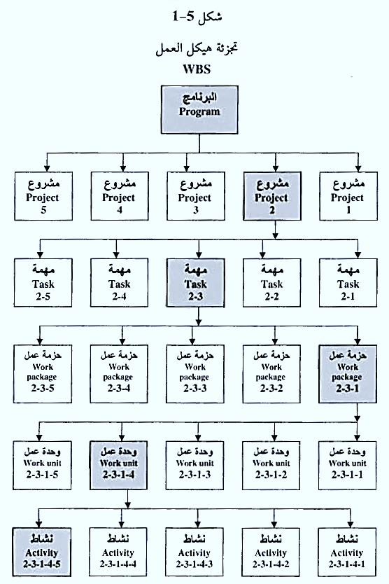 يعتمد إعداد الخطة الابتدائية على مفهوم تجزئة هيكل العمل Work Break Down Structure كما هو موضح في الشكل 5-1 ويتم من خلاله تحليل العمل هرميا من الأعلى إلى الأسفل على النحو التالي: