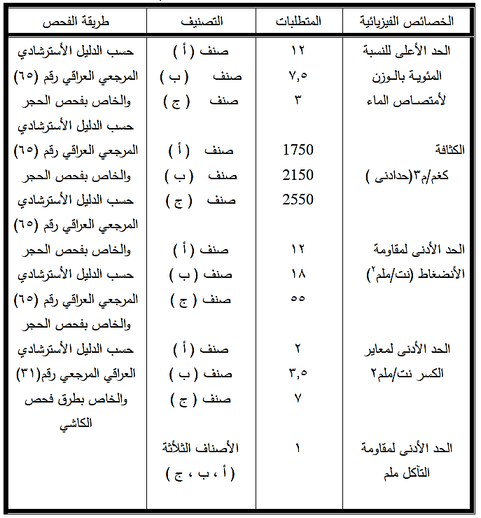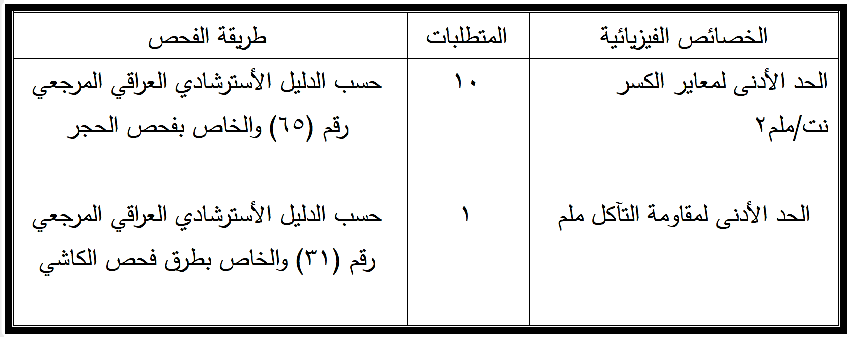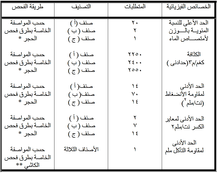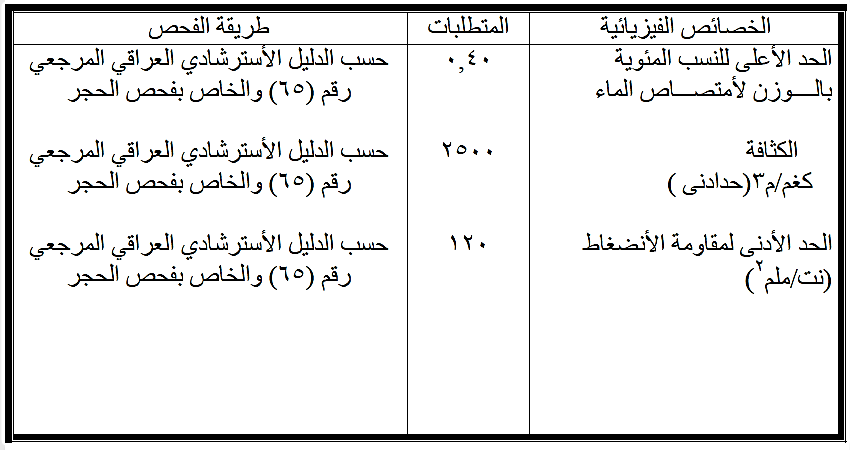 تحدد الفحوص الواجب أجراؤها حسب الأستعمال وكما مبين في الجدول رقم ( 5 - 16 ) و يعتبر الحجر مطابق عند اجتيازه تلك الفحوص.
