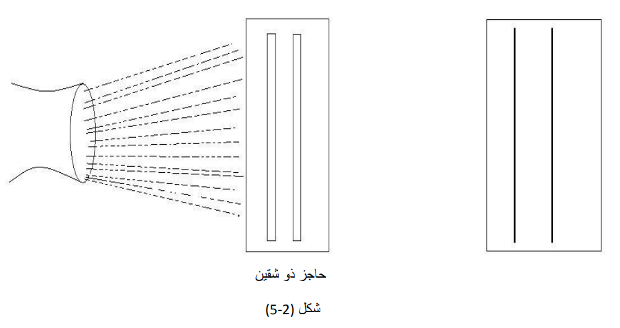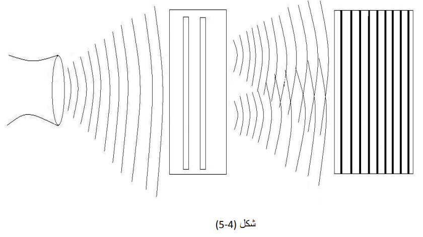بناءا على ذلك نستطيع تفسير تجربة ذات الشقين كالتالي: عندما يصدر الإلكترون المفرد من منبعه، نستطيع تصوره وقد خرج على شكل موجة، وعندما يدخل من كلا الشقين يتداخل مع نفسه، وإذا تداخلت كل الالكترونات المفردة مع نفسها، ينتج الشكل (4-5). لكن إذا قمنا بوضع كاشف عند الفتحتين، فأن الفوتون سوف يصدم الإلكترون مما يؤدي إلى تغيير حالته الأولى (الموجية) الى الحالة الثانية (الجسيمية)، فيقوم الإلكترون بضرب الشاشة كجسيم، وبالتالي يظهر الشكل (2–5).