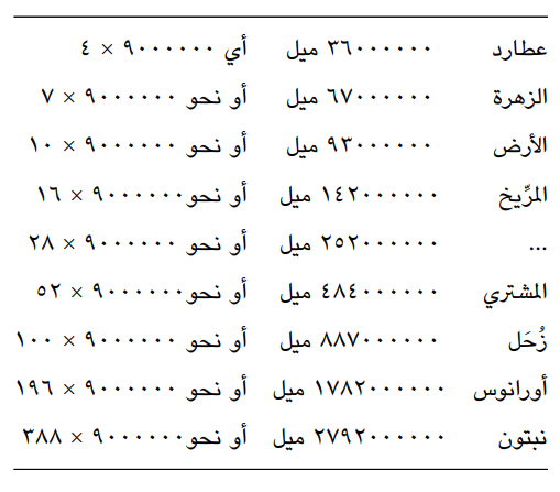 وقد رأى علماء الفلك حينئذ أن أبعاد السيارات جارية على النسبة التالية تقريبا، وهي 52 وأنها مكونة من الأعداد التالية وهي: