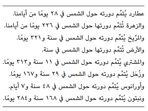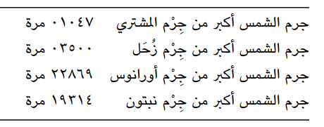 وعليه فجرمُ الشمس أكبر من مجموع أجرام السيارات كلها سبعمائة مرة؛ أي إنَّ الشمس أثقل من كلِّ السيارات التي تدور حولها نحو سبعمائة مرة إذا اعتبرنا الثقل موازنا للجزم، وإذا أُضيفت أقمار السيارات إليها فجرْمُ الشمس أكبر من حرم السيارات وأقمارها أكثر من ستمائة مرة؛ ولذلك لا عجب إذا جذبت الشمس سياراتها وأدارتها حولها هي وأقمارها بسهولة لكبرها بالنسبة إليها.