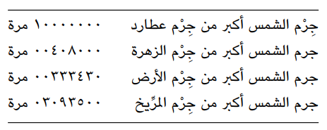 أنَّ قُطر الشمس نحو 866000 ميل وقطر الأرض 7917؛ أي إنَّ قُطر الشمس أكبر من قُطر الأرض نحو 110 مرات، ومعلوم أن مساحات الكرات ككعوب أقطارها فيكون حجم الشمس أكبر من حجم الأرض نحو مليون و331 ألف مرة؛ أي لو قسمت الشمس كرات كل كرة منها قدر كرة الأرض حجمًا لتكون منها مليون و331 ألف كرة، ولكن كثافة الشمس نحو ربع كثافة الأرض؛ أي إذا كان وزن المتر المكعب من الأرض خمسة أطنان فوزن المتر المكعب من الشمس نحو طن وربع لا غير، والأرض أكثف السيارات كلها ومع ذلك فهي وكل السيارات لا توازن إلا جزءا صغيرًا من الشمس، وإذا قيس جزم الشمس؛ أي مادتها بأجرام السيارات ظهر أنَّ أكبر السيارات وهو المشتري يبلغ جزمه أقل من جزء من ألف جزء من جزم الشمس، وأصغرها وهو عطارد لا يزيد حرمه على جزء من عشرة ملايين جزء من جزم الشمس كما ترى في الجدول التالي: