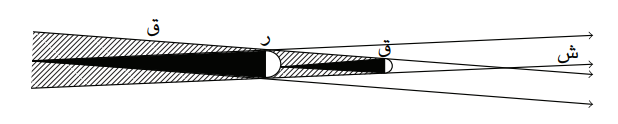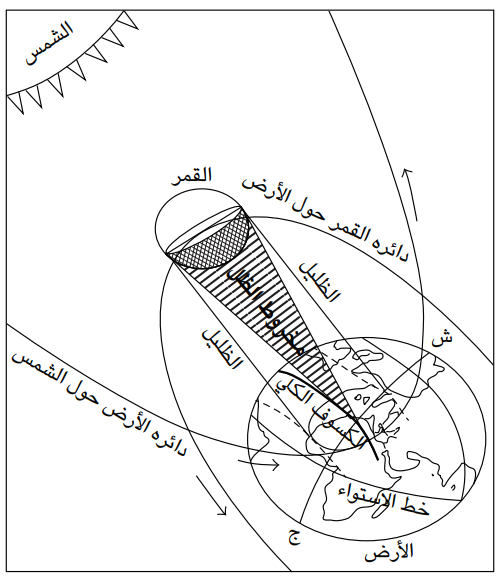 ترى في الشكل 6-6 رسمًا يمثل من الجهة الواحدة أشعة الشمس وقد وقعت على القمر «ق» وهو بينها وبين الأرض «ر» فحدث الكسوف الكلي، ومن الجهة الأخرى الأرض واقعة بين الشمس والقمر فوقع ظلُّها عليه فخسفه، لكن الكسوف والخسوف لا يحدثان في وقت واحد كما لا يخفى.