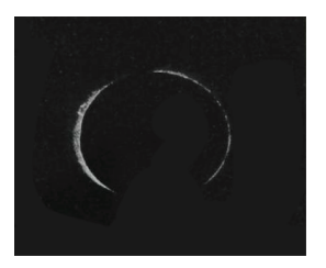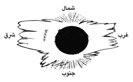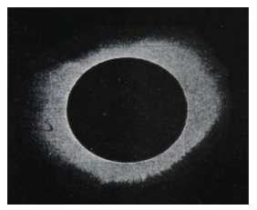 وليس بين الحوادث السماوية ما هو أوقع في النفس من منظر الخسوف والكسوف ولا سيما منظر الثاني إذا كان كليًّا، فأظلم به الجو وانتقل الناس في دقائق قليلة من النهار إلى ما يشبه الليل. وما حدث الكسوف الكلي في 21 أغسطس سنة 1914 بعد ابتداء الحرب رصده علماء الفلك في أسوج فرأوا أنه لما كان القمر يحجب كل وجه الشمس كما ترى في الشكل 6-3 المقابل ابتدأ ظهور الإكليل، وما تمَّ الاختفاء ظهر الإكليل ببهائه كما ترى في الشكل 6-4 وبان حينئذ للعين المجرَّدة كما ترى في الشكل 6-5 ولكن هذه الصورة لا تدلُّ على بهاء المنظر وجلاله؛ لأنَّها خالية من الألوان البديعة التي ترى حينئذ من أبيض وأصفر وبرتقالي وأحمر وبنفسجي ومهما يتفنّن المصوِّرون لا يبلغوا ما يرسمه النور في السماء من بديع الألوان.