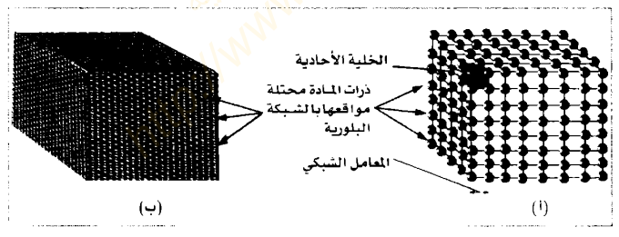 ويوضح الشكل (3 – 1 «أ ») رسما تخطيطيا للشبكة البلورية الخاصة لأحد العناصر التابعة لفصيلة المكعب البسيط والتي فيها ينتظم ترتيب الذرات على نقاط الشبكة مكونة بذلك شكلا هندسيا منتظما تتساوى أبعاد جميع أضلاعه. وإذا ما نظرنا إلى الشكل المذكور، فسوف نلاحظ أن الهيكل الكلي للمكعب يتألف من عدة مكعبات أصغر، يُطلق على ي الواحد منها اسم الخلية الأحادية Unit Cell والتي تتجمع بها كل صفات وسمات وخواص المادة، ومن ثم فهي بمنزلة جينات الخلايا الحية التي تحدد الصفات الوراثية المتعلقة بسمات الكائن الحي. وكما تختلف البصمة الوراثية من إنسان لآخر، فإن مقاييس أبعاد الخلية الأولى للمادة تختلف من مادة واحدة إلى أخرى، بحيث لا توجد مادتان متطابقتان بتلك الصفة على الرغم من وجود هذا الكم الهائل من المواد الطبيعية والصناعية (6). ونستطيع التعبير عن مختلف خواص المادة وذلك من خلال تحديد قيمة مقياس أبعاد خليتها الأحادية، حيث يُطلق على هذا البعد مصطلح مُعامل الشبكة البلورية Lattice Parameter. ومن الجدير بالذكر أن المواد الموجودة على شكل هندسي واحد كالمكعب مثلا، وعلى الرغم من اختلاف قيم معاملات شبكاتها، فإنها تتشابه في الصفات والخواص الكيميائية والفيزيائية. هذا وينطبق المفهوم نفسه أيضا على المجموعات الأخرى من الشبكات البلورية التي تترتب فيها الذرات على هيئة أشكال هندسية أخرى منها متوازي المستطيلات والمسدس والمعين.