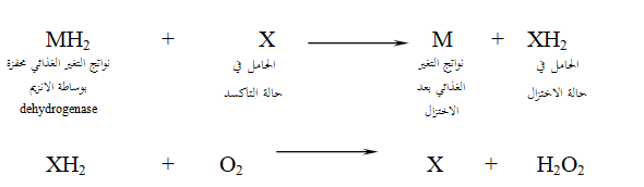 والخطوة النهائية في عملية الاكسدة تتضمن اتحاد ذرة الهيدروجين مع جزيئة الاوكسجين لتكوين جزيئة الماء. ويمكن للاوكسجين اكتساب ذرة الهيدروجين المحفزة مباشرة غير ان عملية الاكسدة عند التمثيل تتضمن في اكثر الحالات خطوة وسطية تنتقل فيها الالكترونات (الكترونات الهيدروجين) الماخوذة من نواتج التغير الغذائي في الخلايا الى حامل الالكترون (Carrier) حيث يمكن للحامل المختزل ان يقوم بوظيفة الاختزال حيث الكترونه المنقول الى جزيئة اخرى مثل جزيئة الاوكسجين او حامل اخر كما هو مبين في المعادلات التالية: