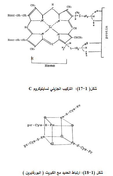 حيث يتضح من المعادلات اعلاه جزيئة السايتوكروم تقوم كما هي الحالة مع بروتين الحديد-الكبريت (Fe-S protein) شكل (1-18) ، بنقل الكترون واحد ولهذا يتطلب وجود جزئتين سايتوكروم وجزيئتي بروتين حديد –كبريت لنقل الالكترون الناتجة عن اكسدة جزيئة NADH.