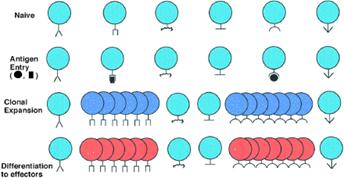 3. Upon contacting its appropriate antigen, the lymphocyte is stimulated to proliferate (clonal expansion) and differentiate.