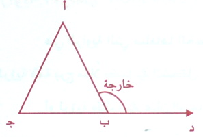 وهي بالنسبة للمثلث أولاً : الزاوية الناتجة من مد احد اضلاعه والمتكونة من احد اضلاعه وامتداد الضلع الآخر كما في الشكل .