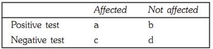 a = the number of individuals with disease whose screening tests are positive (true positives). c = the number of individuals with disease whose screening test are negative (false negatives). d = the number of individuals without disease whose screening tests are negative (true negatives). b = number of individuals without disease whose screening tests are positive (false positives).