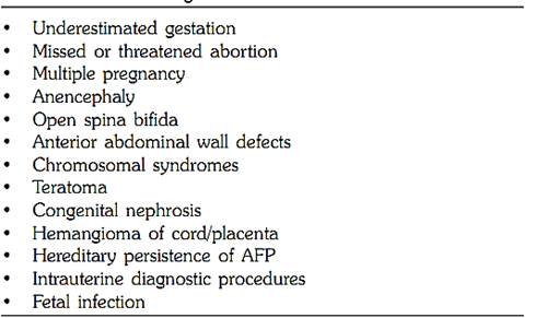 Maternal serum AFP (MSAFP) levels are raised above the base line in pregnancy due to transfer of AFP across the placenta and amniotic membrane. The concentration of MSAFP rises continuously throughout pregnancy, reaching a peak level at 20 weeks and then decreases. There is an association between elevated amniotic fluid AFP (AF-AFP) and open neural tube defects. However, it would not be feasible to perform AF-AFP as a screening test for NTD. Estimation of AFP in maternal serum was a more practical method. (MSAFP) levels more than twice the median value (>2 MOM) at 16-18 weeks of pregnancy can be used to detect 90% of the affected fetuses. This allowed the development of an effective screening program in UK since mid 1972. Prenatal screening by MSAFP can also provide information on other fetal abnormalities or pregnancy complications (Table.1), which may be associated with elevated MSAFR The significance of low MSAFP along with raised levels of beta hCG and low estriol has been reported to be more predictive with reference to Down’s syndrome and is now routinely used as a screening method to pick up high risk pregnancies for Down’s syndrome. For calculating the risk maternal age, weight, diabetic status and exact gestational age is taken in to account. A combination of Triple Test with increased nuchal thickness on ultrasound can pick up to 85% of at risk babies for Down’s syndrome. Thus, a single specimen of blood taken at 16 -18 weeks can be used to screen for Down’s syndrome and open neural tube defects.