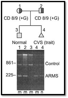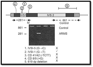 Fig. 1: The beta globin gene map showing some common mutations. The lower half shows agarrose gel electrophoresis of products generated using the ARMS technique. Courtesy Dr. John Old, National Hemoglobinpathy reference Center, Oxford, UK