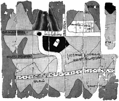 وبهذه المناسبة يجب علينا أن نتحدث عن بردية اشتراها «درافوتي» من «طيبة»، وهي الآن محفوظة ضمن نفائس متحف «تورين»، وقد صُوِّر عليها على حسب ما وصلت إليه معلوماتنا أقدم مصور جغرافي في العالم، وهذا المصور قد مثل عليه الأصقاع التي يوجد فيها الذهب في وادي النيل، فنرى فيها الجبال، والطرق، والعمل، والمباني المختلفة، كما نشاهد لوحة نُقش عليها اسم «سيتي الأول»، وهي تقع بجوار بئر في قطعة أرض مزروعة، ومن هذه الإشارة عرفنا أن هذه البردية قد ترجع إلى عهد «سيتي الأول»، وقد قامت محاولات عدة للتعرُّف على البقعة التي تمثل هذا المصور على وجه التأكيد، ولكن الأمر لا يزال تكنفه بعض الشكوك، ويظنُّ «توماس» أن المناجم القديمة المسماة «داراهيب darahib « الواقعة في «وادي علاقي» هي المكان الذي يمثل هذا المصور (1)،وقد كشف «لينان دي بلفور» عن هذه المناجم ثانية، وعمل لها مصورًا، وبمضاهاة مصور «تورين» القديم بمصور «لينان» في عتبايه وجد «توماس» أوجه الشبه الآتية، وهي: