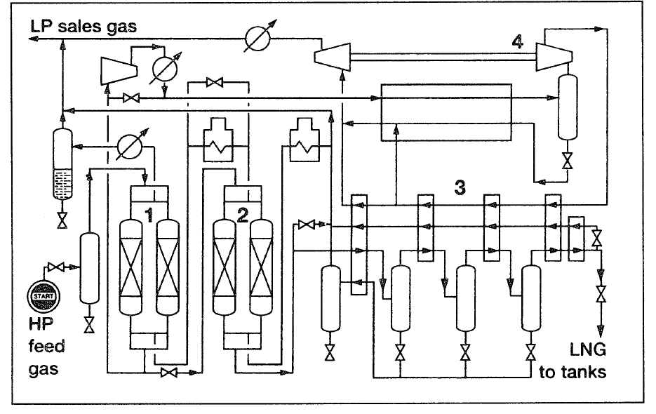 (1) pretreatment (mol.sieve), (2) heat exchanger, (3) turboexpander.