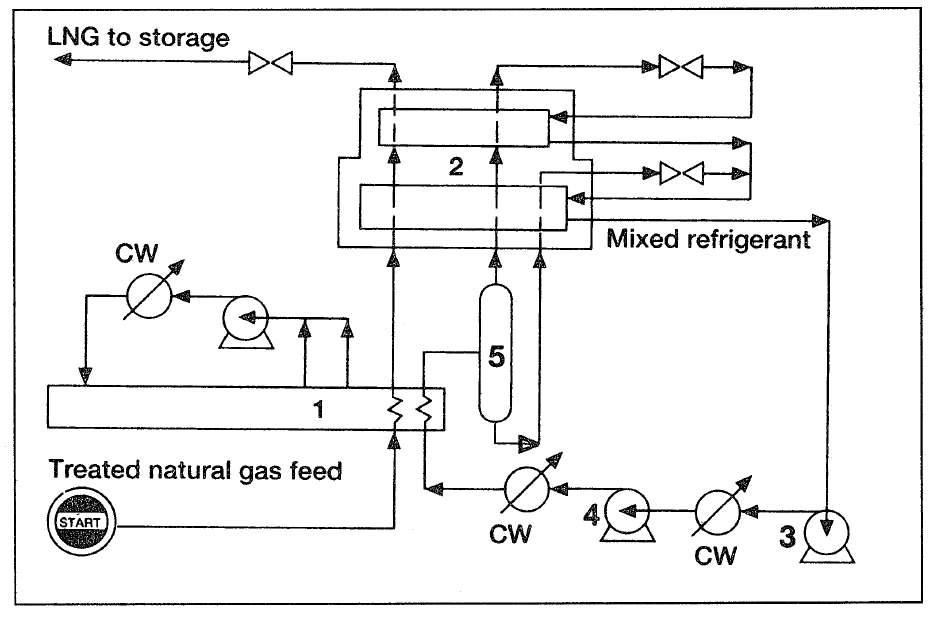 In mechanical refrigeration, a multicomponent refrigerant consisting of nitrogen, methane, ethane, and propane is used through a cascade cycle. When these liquids evaporate, the heat required is obtained from natural gas, which loses energy/temperature till it is liquefied. The refrigerant gases are recompressed and recycled. Figure 2 shows the MCR natural gas liquefaction process.