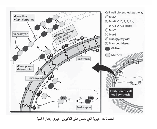 عمليات التكوين الحيوي لجدار الخلية والبناء الحيوي للبروتين على الريبوسومات والتي كانت تاريخياً موقع عمل أكبر عدد من المضادات الحيوية وربما بسبب العديد من الخطوات الإنزيمية التي توفر فرص متعددة لتعطيل هذه الخصائص الرئيسة للخلية البكتيرية السليمة. إن التسلسل الجيني (genomic sequencing) لأهم مسببات الأمراض البكتيرية قد اكتمل أساساً، والجهود المبذولة لتحديد الجينات الأساسية أو الجينات المعززة للفوعية virulence - enhancing genes ) )جارية على قدم وساق .