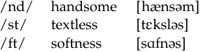 In addition to these, a multiplicity of other triple codas is created via suffixation, the great majority of which are provided by /t, d/ of the simple past tense and by /s, z/ of the plural, the possessive, and the third person singular of the simple present. Also noteworthy are the possibilities created by /θ/, the ‘ordinal number morpheme’ (e.g. sixth[sɪksθ]) and the ending deriving nouns from adjectives (denominal morpheme) (e.g. warmth[wɔɹ̣mθ]). The following list gives the possibilities of triple codas via suffixation in terms of general classes; thus, actually occurring clusters have many more combinations than the examples cited here: