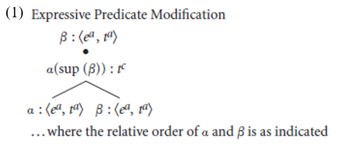 In view of this, we can adopt the rule in (1). Potts’ framework already has a rough counterpart to standard function application that operates in the expressive-meaning dimension – namely, the rule of Conventional Implicature Function Application mentioned earlier. Adopting (1) would maintain the parallelism by adding an expressive counterpart to a rule of intersective modifier interpretation.1