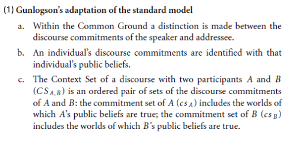The context as defined in (1c) represents a departure from more standard implementations of a Stalnakerian model. Gunlogson takes the distinct discourse commitments of individual participants to be basic, and she uses this to derive a standard Stalnakerian context set. This isn’t to say that one cannot derive the individual commitments from the standard Stalnakerian conception of the context of a discourse, but in order to talk about discourse adjectives, access to individual commitments is crucial. Gunlogson’s model is a natural choice for the ease of exposition.