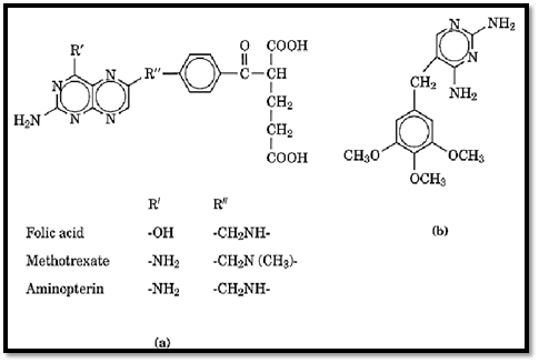 Figure 1. (a) The structures of folic acid and folate analogs: folic acid and analogs; (b) the structure of trimethoprim.