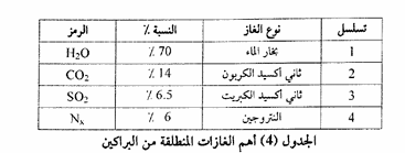 والبراكين تطلق أثناء ثورانها إضافة إلى اللافا البركانية التي تختلف في مظهرها وخصائصها، كميات كبيرة من الأبخرة والغازات والمواد الصلبة والرماد البركاني إلى الهواء، وأهم المواد المنطلقة بخار الماء، وثاني أكسيد الكربون والنتروجين، والكبريت والكلور وغيره، والجدول (4) يبين أهم الغازات المنطلقة من البراكين ونسبتها المئوية.