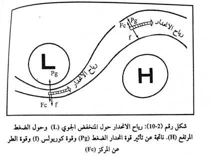 وعندما تصل الرياح حول المرتفع الجوي يتغير اتجاه تأثير القوى الثلاث فتعمل قوة الطرد عن المركز مع قوة المحدار الضغط لدفع الرياح نحو الخارج بعيداً عن مركز المرتفع، بينما تعمل قوة كوريولس على دفع الرياح نحو المركز وحتى تستمر رياح الانحدار موازية لخطوط الكنتور لا بد من حدوث توازن بين قوة كوريولس ومجموع قوتي الضغط والطرد عن المركز، ولحدوث ذلك يجب أن تتزايد سرعة الرياح لتزيد من قوة كوريولس لتتوازن مع القوى الأخرى. وإذا تأخر تزايد سرعة الرياح فإنها تندفع نحو الخارج لأن مجموع قوتي الطرد عن المركز وانحدار الضغط أكبر من قوة كوريولس، مما يؤدي إلى اندفاع الرياح نحو الخارج، فيضعف مركز المرتفع الجوي وتتباعد خطوط التساوي حوله ، وإن رياح الانحدار تضعف عند المحدب Ridge لذلك تتكون منطقة تجميع علوية تسبب تكون منطقة توزيع سطحية (مرتفع جوي).