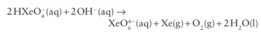 The pyramidal xenon trioxide, XeO3(4) presents a serious hazard because this endergonic compound is highly explosive. It is a very strong oxidizing agent in acidic solution, with E ْ (XeO3, Xe) +=2.10 V. In basic aqueous solution the Xe (VI) oxoanion HXeO4 slowly decomposes in a coupled disproportionation and water oxidation to yield a Xe (VIII) perxenate ion, XeO6-4, and xenon: