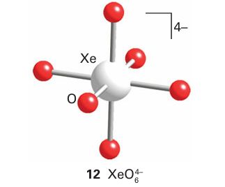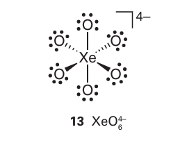 A brief illustration. Thestructure of many xenon compounds can be successfully predicted by using the VSEPR model. The Lewis structure of the perxenate ion is shown in (13). With six electron pairs around the Xe atom, the VSEPR model predicts an octahedral arrangement of bonding electron pairs and an octahedral overall structure.