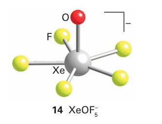 Xenon forms the oxofluorides XeOF2(6), XeO3F2 (7), and XeOF4 (8). When alkali metal fluorides are dissolved in XeOF4, solvated fluoride ions are formed of composition F-.3XeOF4. Attempted removal of XeOF4 from the solvate yields XeOF5 (14), which is a pentagonal pyramid.